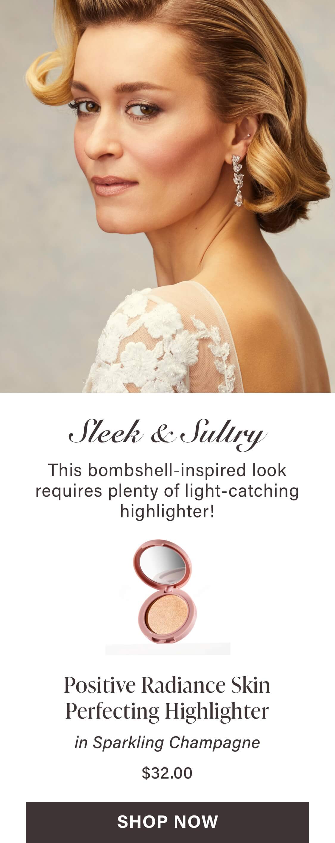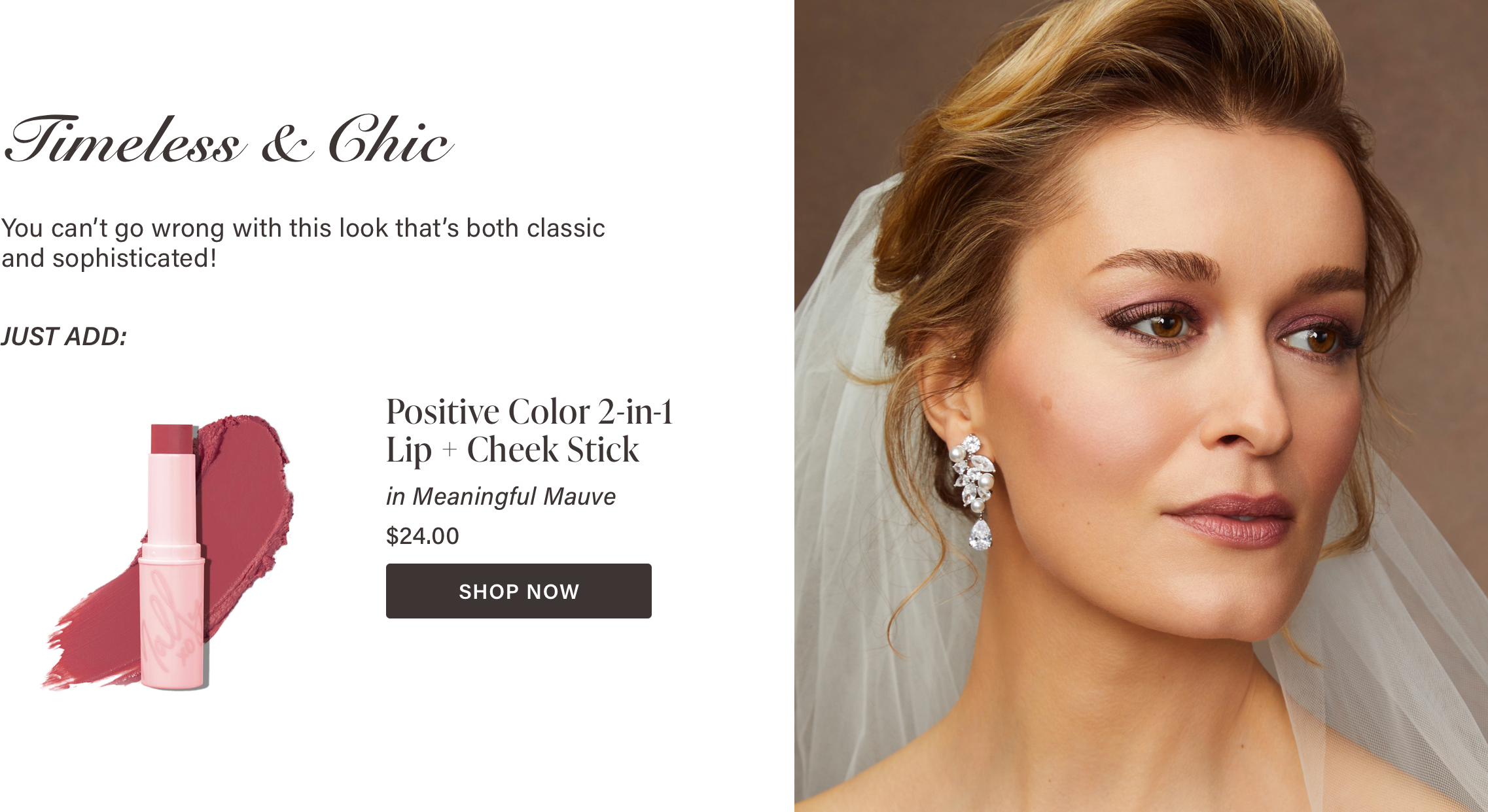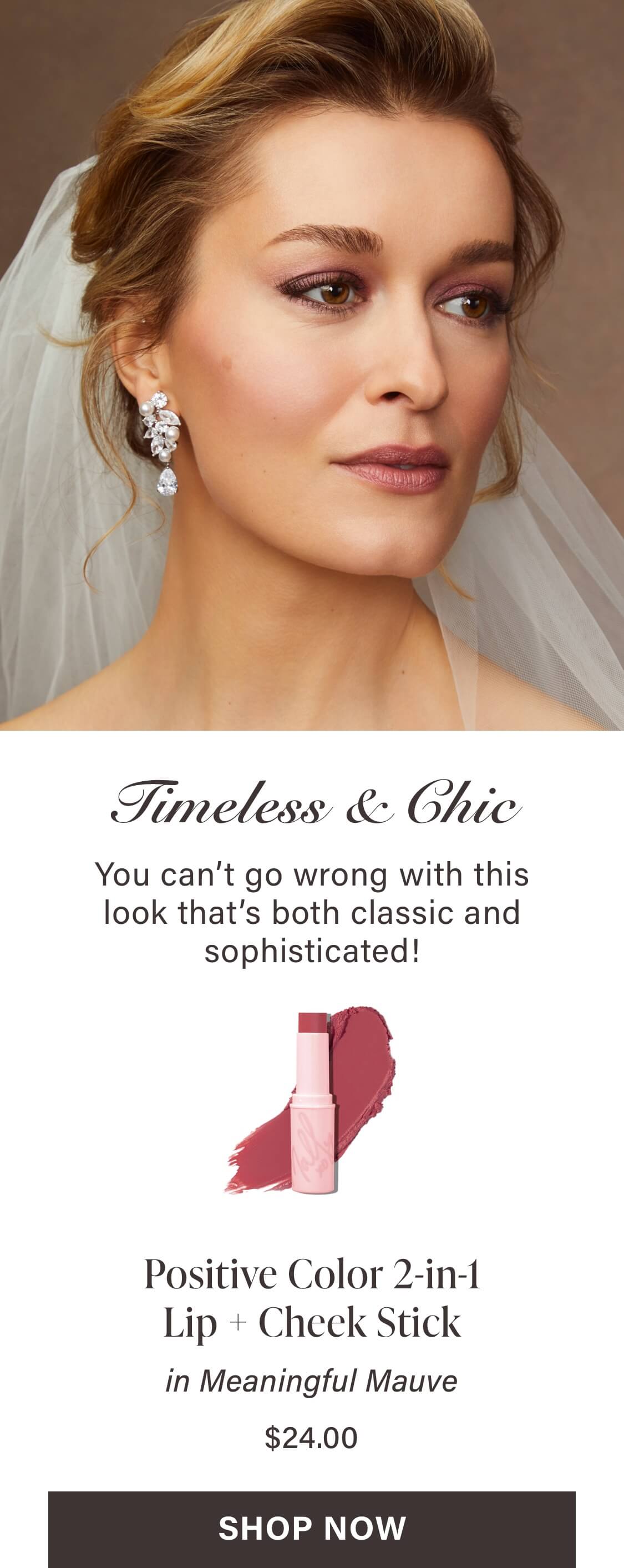 Give eyes an instant lift by sweeping our Evercolor Shadow Stick in Golden Hour (Shimmer) in the inner corners of the eyes and under the browbone to ensure your eyes really pop in photos. The soft, ivory color makes it the perfect bridal highlight too! Just sweep and blend a little on your cheekbones.