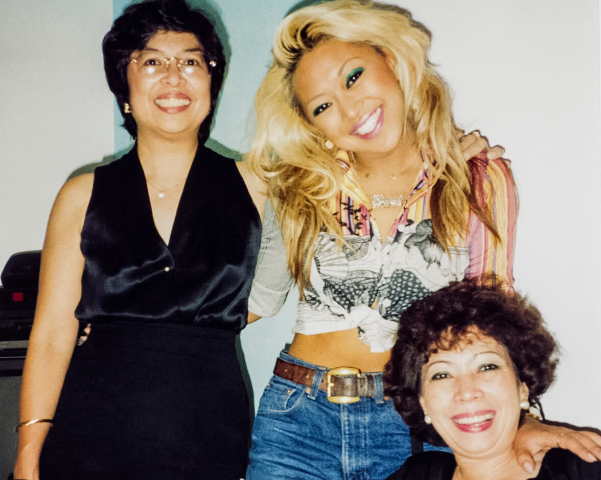 "This was my colorful stage. I was 23, living in New York, and working as a makeup artist and fashion designer. I was a burnt, crispy blonde and I was in full drag every single day. I’m standing here with my Auntie Dulia and Auntie Norma. I was always surrounded by fierce, fabulous, and strong women. They never put makeup on for other people, it was always for themselves. Makeup made them feel like they could conquer the world."